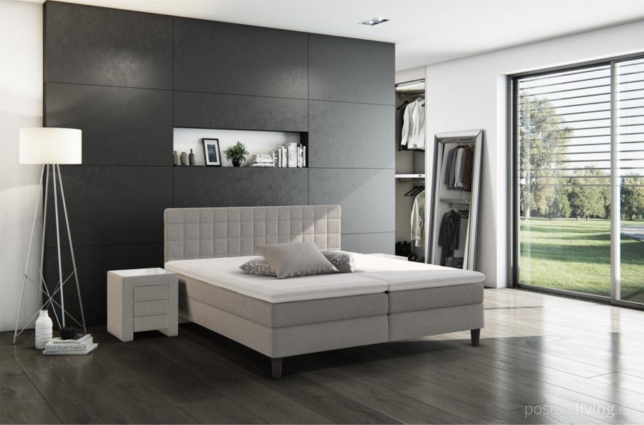 Pro postel SAASFEE je charakteristické čtvercově prošívané čelo s možností výběru výšky v základní a XL velikosti a šířky až 280 cm. Možno také objednávat s předním čelem DAVOS.